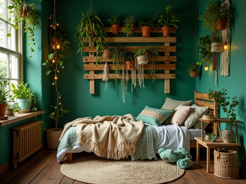 Predstavljajte si najstniško sobo, ki je spremenjena v bujni, boemski prostor, idealen za najstnika, ki je obsedena z rastlinami in naravo. Začnite z globoko smaragdno zeleno barvo na steni (barva približno 20 USD), ki bo služila kot osnovna barva, in jo dopolnite z mehkejšimi odtenki zelene in zemljišči terakote, da bo prostor prijeten. Okrasite ga v boemskem stilu: obesite makrame držala za rastline (DIY z vrvjo za 10 USD) na strop in ustvarite kaskadni "džungelski" učinek.