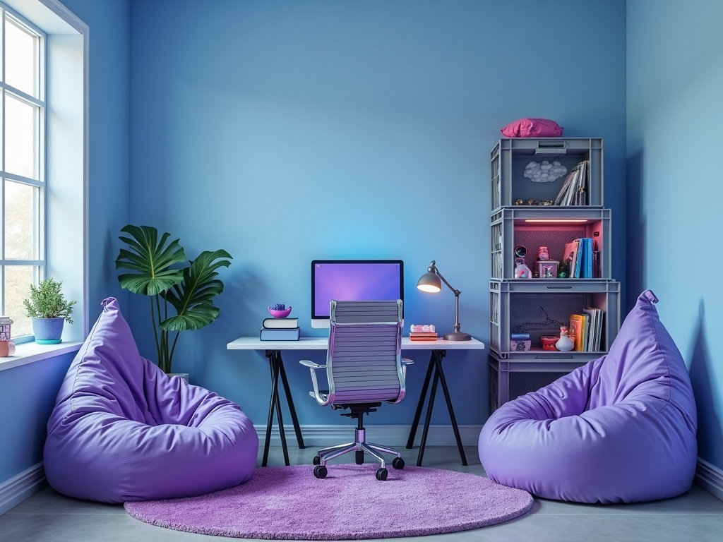 Za najstnika, ki je obsedena s starodobnimi igrami in neon estetiko, ustvarite retro-futuristično najstniško sobo. Izberite drzen barvni odtenek: električno modre stene z poudarki rožnate in črne barve za dinamično vzdušje. Srečanje med modernim slogom sredine stoletja in igrami – razmislite o vinilnih ploščah kot stenski dekoraciji in okvirju za starinsko plakato iz trgovine z rabljeno robo.