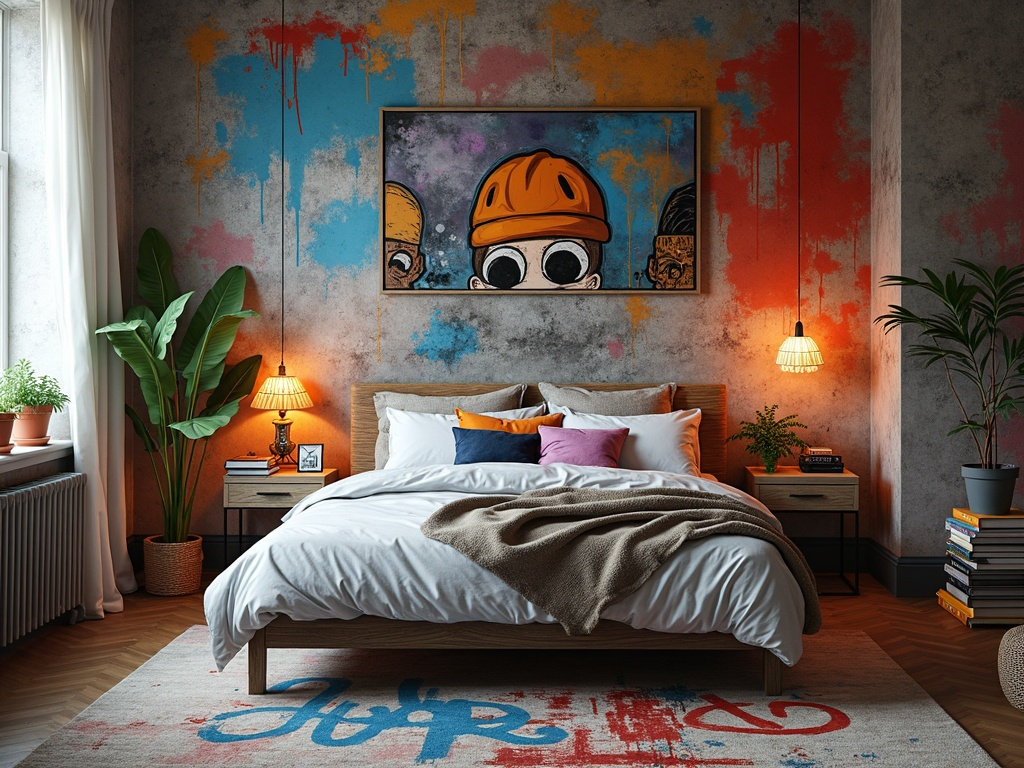 Spremenite najstniško sobo v navdihujoč prostor, ki spominja na ulično umetnost, za ambicioznega umetnika ali skejterja. Uporabite temno sivo barvo na steni in jo dopolnite z živahnimi, grafiti podobnimi potezami v rumeni, vijolični in turkizni barvi, da ustvarite urbano vzdušje. Prevladuje industrijski slog: izpostavljeni zidni okraski in kovinski elementi za čvrst videz.